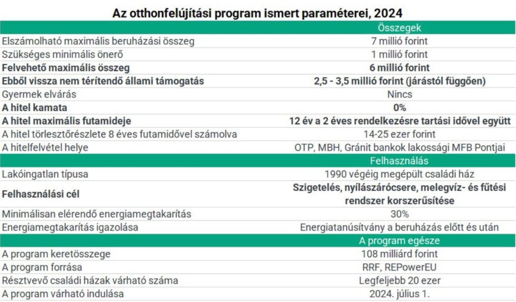 A kormány bejelentette , hogy az új otthonfelújítási program 2024. július 1-jén indul. Az otthonfelújítási programban az 1990. december 31-e előtt használatbavételi engedélyt kapott, életvitelszerűen lakott, egy- és többlakásos családi házak energetikai korszerűsítésére adható támogatás.
